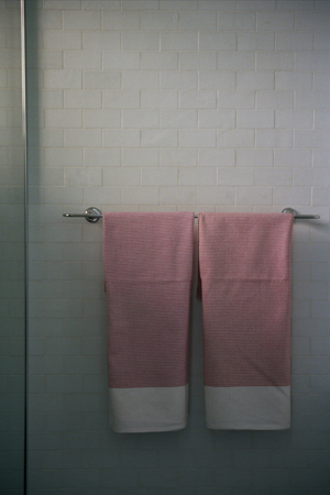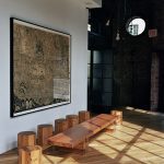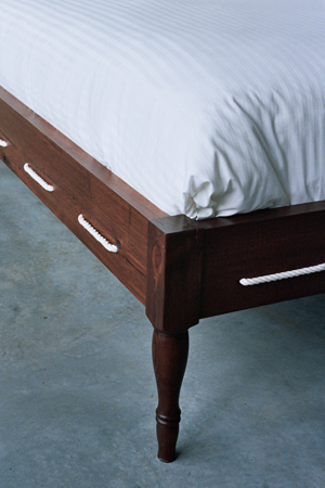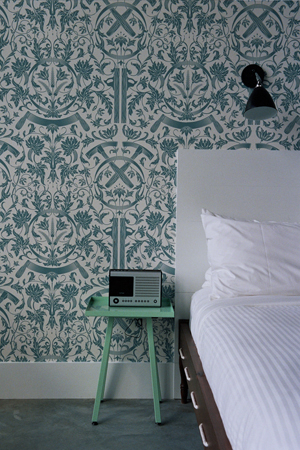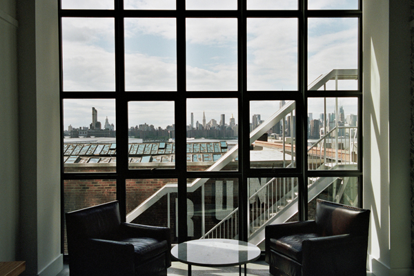 Of course, no Brooklyn building is complete without some work from Steven Powers to lighten the mood, so there are a few of his distinctive painted signs, which can be viewed through the event space and on the private second-floor terraces. Each of the 62 queen and king beds, and all the desks and windowsills, were made from wood salvaged from the building—mainly the removal of the west bay, which was replaced with glass to take advantage of the skyline views. Dave Hollier, who runs a woodshop just steps away, turned the work around in a matter of weeks, which may be why Lawrence calls him “a total sweetheart.” Flavor Paper’s Dan Funderburgh created custom wallpaper for the rooms, including a tongue-in-cheek Williamsburg pattern featuring tire-less bike frames and shoes hanging from power lines. These details combine in masculine but airy rooms that don’t try to hide their industrial past. The eco-friendly bath products by Goldie’s are notably not in wasteful travel containers, and you also won’t find any disposable slippers, notepads, or room-service menus.
