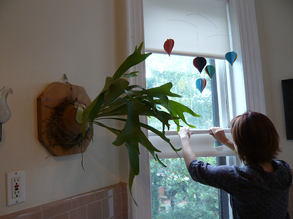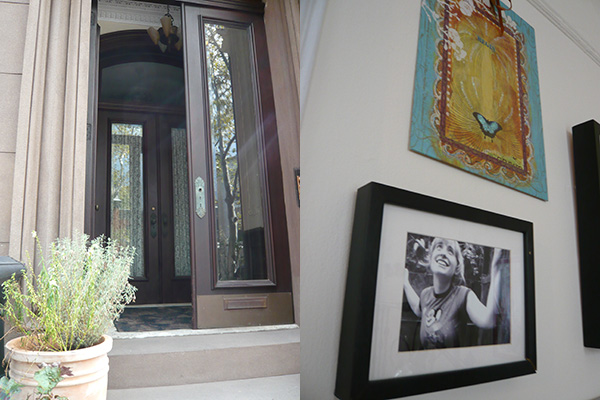 Mack walks through the brightly lit and colored apartment, tidying as she goes, explaining how she came across each piece of art. The water colors beside her bed are by Kate Parr. The Klimt-like painting of the woman in the blue dress is by Jordan Bent. She has a few portraits by her ex-boyfriend Chad Krowchuk. Her friend Adam Kurtzman made the gnarled, metal foot sculpture and the orange glass lamps.