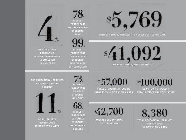 Downtown Brooklyn is New York City’s college town. With 57,000 students from 11 colleges and universities attending school in the area, there is tremendous opportunity to build relationships between students and the rest of the community, and to ensure that the growth of those institutions enriches the Downtown experience.