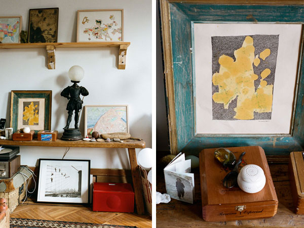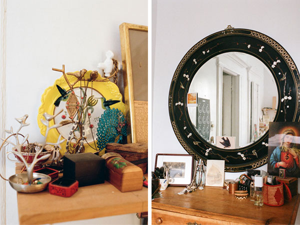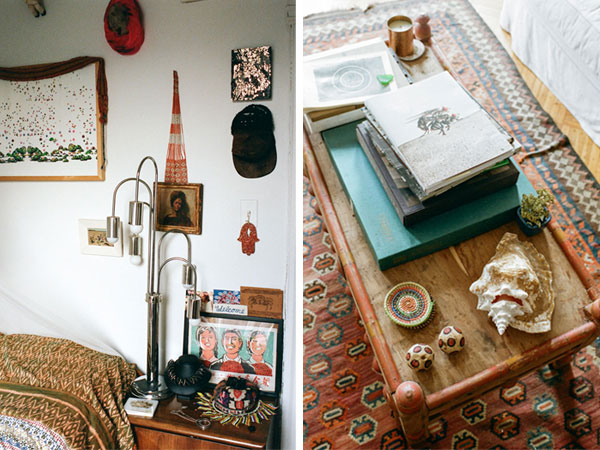 Though it somehow never feels cluttered, this space is filled with a miscellany of oddments accumulated over the course of the lives of its occupants—and each one has a story to tell: an Ikat textile adorns Wass’s bed, under the watchful eye of a flying pig (both acquired on trips to Bali); a handwoven belt bought in a Bolivian market hangs next to a ceramic necklace made by Wass’s grandmother; a one-armed lamp named “Hernani” stands guard over Ginsberg’s art; a yard sale of objects populates Wass’s bedside table—“vintage bracelets, a glass pendant that my mother made for me, striated rocks given to me by Bedouin friends while traveling in Jordan, a little tool for weaving yarn into a square cord, coins from various countries, shells from various beaches, a vintage umbrella sent from a friend in Australia…”—providing daily inspiration.