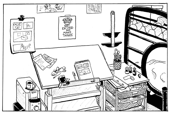 I love my bedroom/office. It’s got a little spot to sit by the window and drink coffee, storage for my many (many!) comics, and thick blackout curtains to keep out the sun until I’m ready to wake up. And I can look over my original art pieces – I’ve got a pencil sketch of Aquaman from Silver Age artist Ramona Fradon, and a page from Smax!, written by Alan Moore. My favorite time is the early afternoon – light from the window lands right on my drafting table.