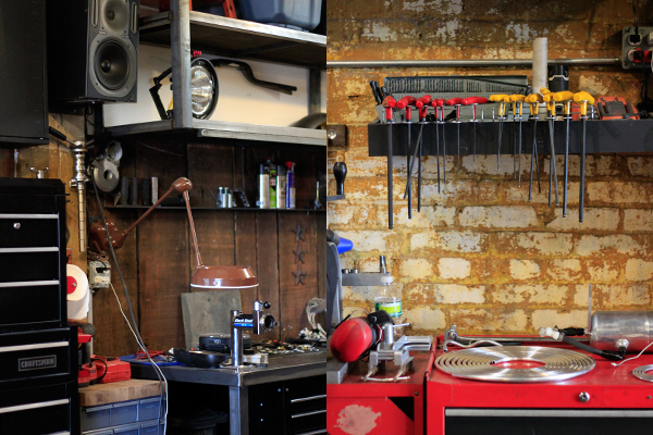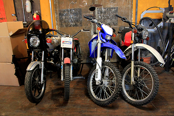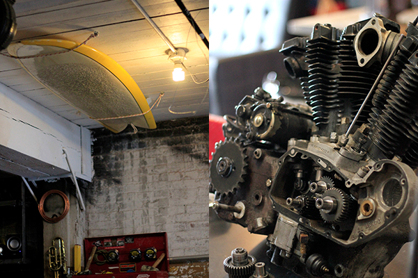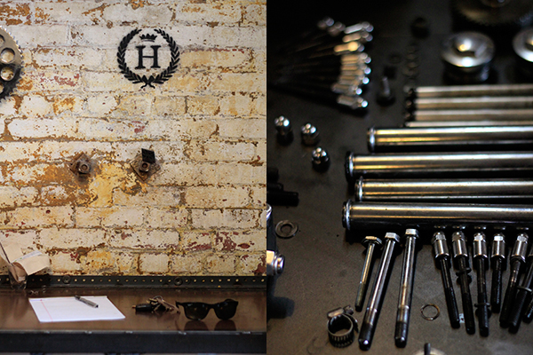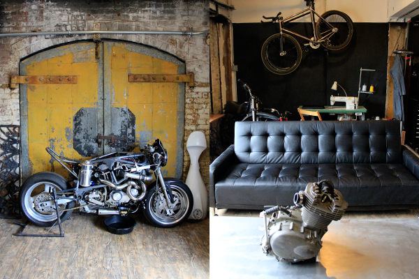 Though he’s since left contracting behind to focus on his work with motorcycles (“I took a pay cut to do something I actually like,” he says), there are still remnants of former projects all over the studio. Formerly home to an online retailer for vaporizers, the space now has custom wooden floors, paneled walls, and furniture all built by Hazan, including a table made from the base of an old sewing machine. “The junk stores in the neighborhood, they always have old meat grinders, old tools, things like that, sometimes I grab pieces of those,” he explains. There’s also a fixed-gear bike he put together himself, a nod to his effort to scale back on actually riding motorcycles after a particularly bad accident a few years back. “You’re always more well-behaved on a bicycle,” he admits.