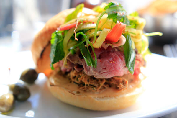 This sandwich makes us want to cry, and not because we cry easily, but because it is so completely what we want and need in our food. Served on a warm, soft roll, this sandwich features two kinds of vibrantly spiced lamb (rillettes and shredded, roasted leg of lamb), pickled vegetables, and shishito peppers (which, they’re the best kind of peppers…eat them whenever you get the chance). As rich and sort of beautifully gamy as the lamb is, the herbs and pickles give it a brighter flavor profile than a lamb sandwich usually has. Eat this sandwich. Eat them all. Enjoy.