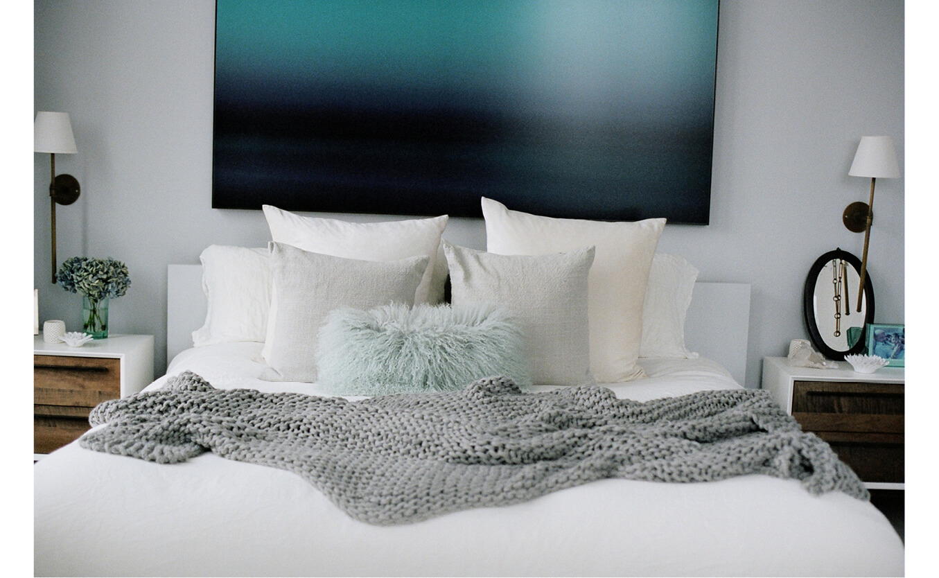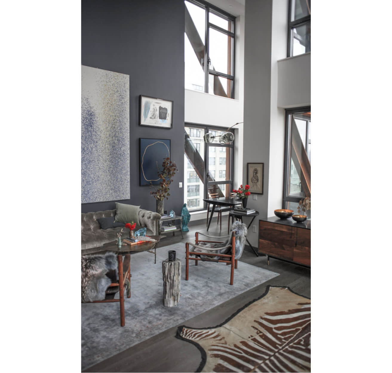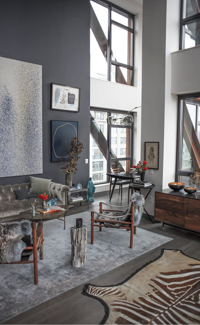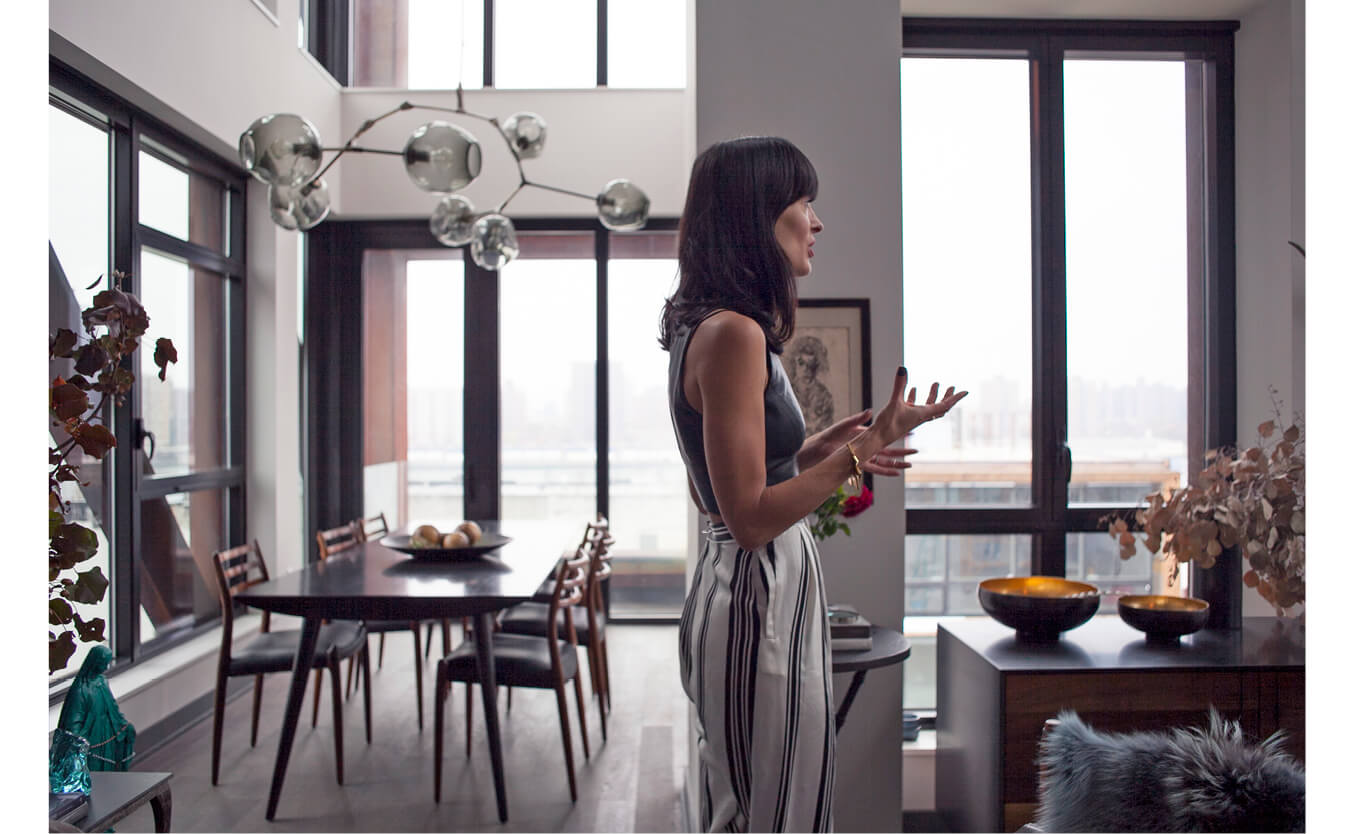 Interior designer and lifestyle maven Athena Calderone—whose website EyeSwoon is a must-visit for anyone who loves to eat, cook, craft, or decorate—has the kind of apartment that takes your breath away the moment you step off the elevator, which opens right into her home. What’s most remarkable, though, is that despite the impressive art collection, immaculately styled furnishings (which are a healthy blend of modern and vintage), and towering windows, the apartment doesn’t feel at all like a set piece but rather like what it is: a well-lived-in home to Athena, her husband Victor (a world-renowned music producer and DJ), and their son, Jivan. It looks like this duplex in DUMBO has been home to the Calderones for years, but she says, “We’ve been here about a year. We are a little bit of serial movers; we’ve moved about every two to three years.” It is possible, though, that all that moving has only made Calderone more aware of what she wants, and more able to execute that vision. “I’ve reinvented myself and my design sense so much through each apartment,” she says. “I love collecting things. I love going on the hunt. That’s what excites me, finding and curating objects. And I love the stories behind the objects. That’s why I love collecting oddities and vintage things, because they add warmth, especially to a really modern space like this.”