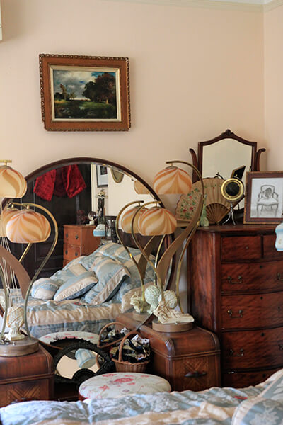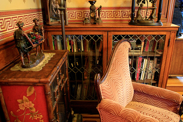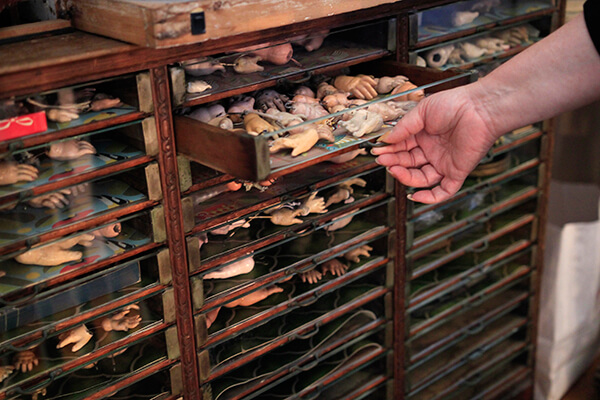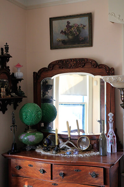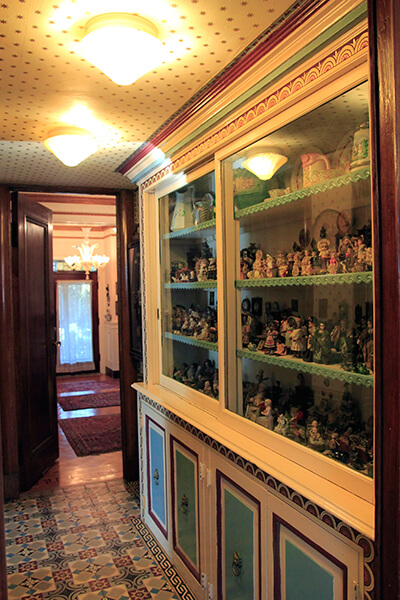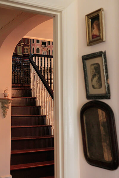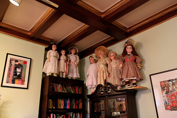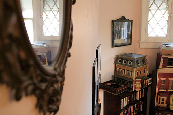 There are countless details in the house that catch your eye—Libraty is also an accomplished visual artist, and her arresting photographs and sculptures are found in most rooms, as well as along the magnificent staircase—but the one undeniable presence is that of the dolls. Libraty and Hechenberger entered the antique doll business in the mid-80s after a chance encounter with a dumpster full of dolls. The contents of an old house were being rather unceremoniously disposed of and Libraty and Hechenberger rescued some of the dolls, setting off on a professional journey that has spanned almost 30 years and proven financially lucrative (“I have to say, the dolls paid for the house”) but has also informed their personal space. There are only a few places in the house where there aren’t dolls—“they’re not allowed in the kitchen, the bathrooms, the bedrooms”—but almost everywhere else there are toddler-sized, delicate bisque-head dolls or glass-fronted cabinets with an abundance of miniature dolls that Libraty has arranged just so, and there are curiosity cabinets with drawer after drawer full of detached doll hands and glassy, unblinking eyes. Libraty laughs when she mentions a friend who once asked her, “Aren’t you afraid the dolls are going to wake up?”