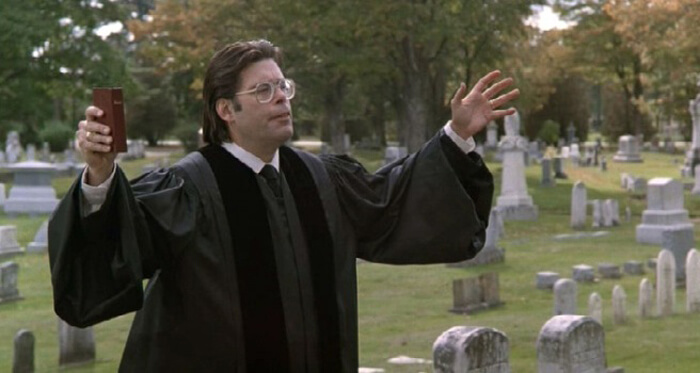 If children don’t first learn about death through their grandparents, it’s usually through their pets. This magnificently mad movie, adapted by Stephen King from his novel, offers plenty of chances: it kills a cat, it kills a surrogate grandpa, it kills a son and baby brother, a mommy and a daddy, but still—no one seems to learn a damn thing about dying, which is what makes Pet Sematary sting. The opening credits linger on the title boneyard, filled with cats and dogs and goldfish, most of which (ichthyoids excepted) strayed onto a nearby rural route favored by speeding semis; the camera soaks up the goofy epitaphs while the soundtrack blares a creeped-out children’s choir. From the start, this a silly movie, also overwrought, fusing the two until it approaches something grand and gonzo and tragic and meaningful, summed up by the chorus of the end-credits Ramones theme, goofily commercial but also oddly moving: “I don’t want to be buried in a pet sematary/I don’t want to live my life again.”