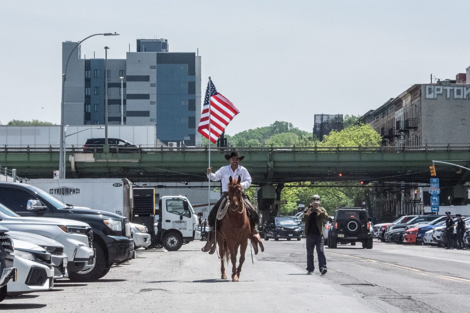 An event that had been advertised as “Cowboys for Trump,” promising protesters riding horses in the shadow of the Gowanus Expressway, yielded a turnout of fewer than 10 supporters and one single lone ranger for Trump. Couy Griffin, waving an American flag atop his steed, wowed construction workers (one of whom wanted to take a picture with the horse and rider saying, “you don’t see this every day!”), annoyed cops who don’t have cowboys in their playbook, and galvanized the scant few who turned out in support.
